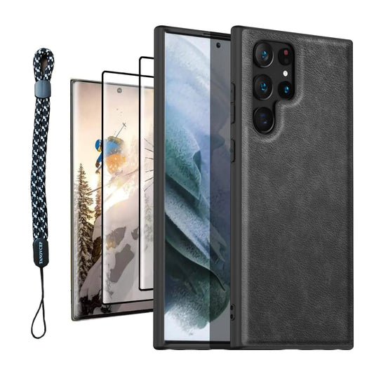 TANOVCEP 4-in-1 Samsung Galaxy S22 Ultra Case with Lanyard – PU Leather Shockproof Cover + 2-Pack 9H Tempered Glass Screen Protectors – Black