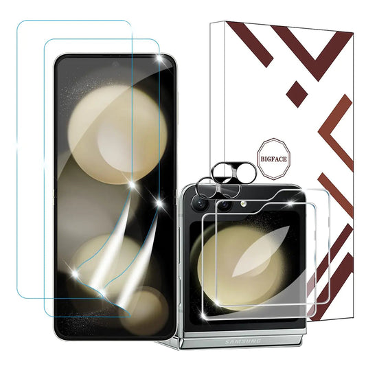 BIGFACE 6-in-1 Screen Protector Set for Samsung Galaxy Z Flip 5 – 2 EPU Front Films, 2 Tempered Glass Back Covers, 2 Camera Lens Protectors